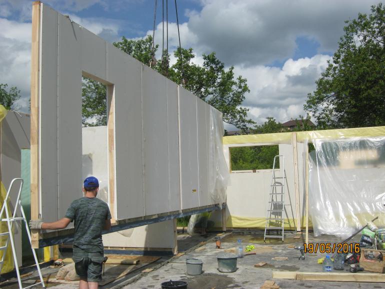 Наша технология - возведение каркасных домов, из панелей произведенных на нашем заводе - дает нам максимальную мобильность. Сделали стены и фермы на заводе, привезли их в Мариуполь, собрали! Фото сборки каркасного дома в Мариуполе смотрите здесь.