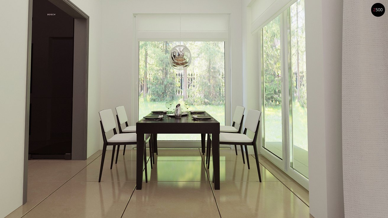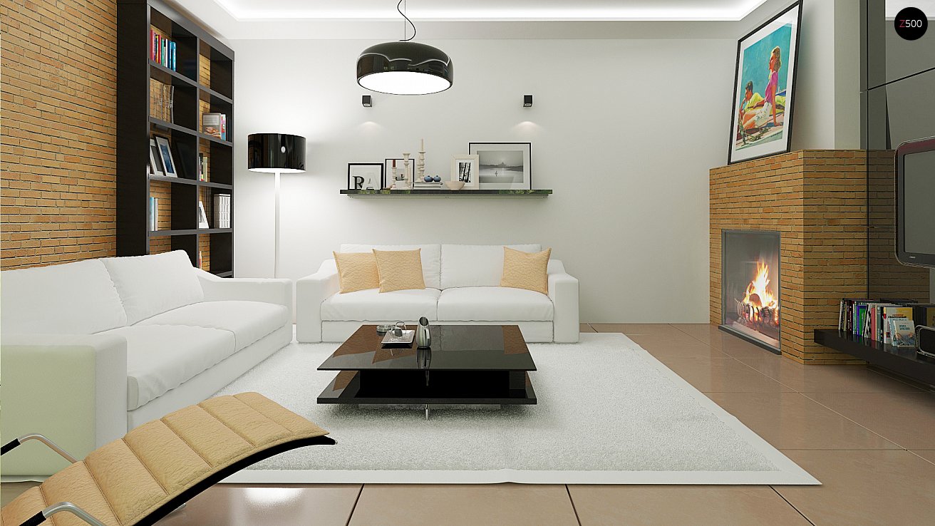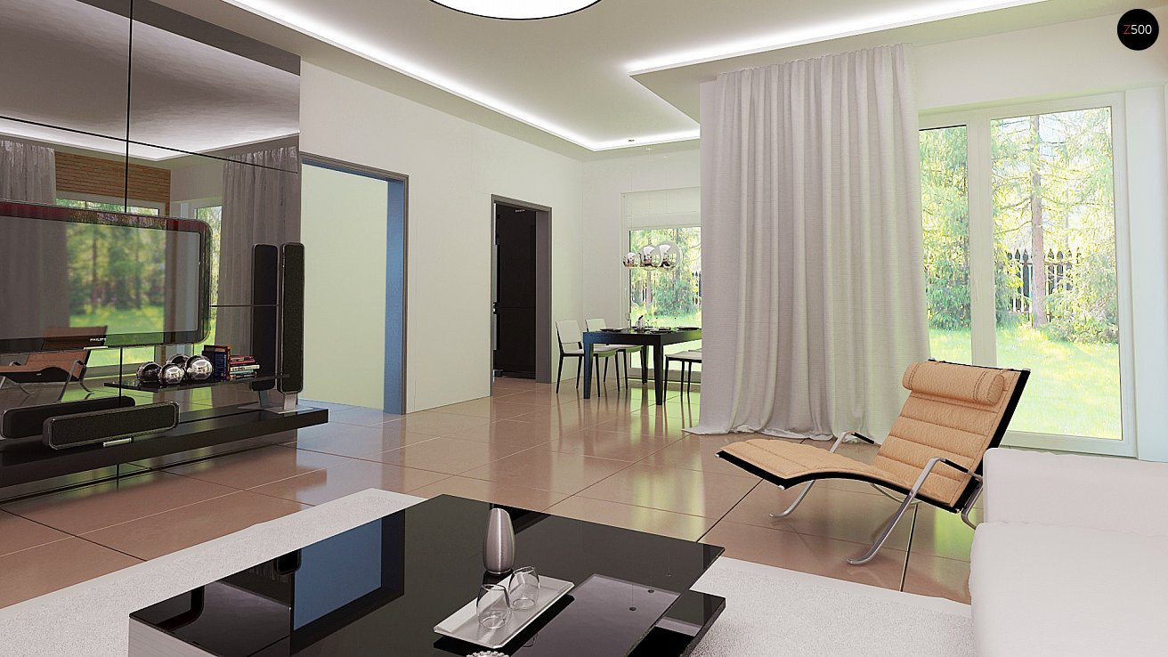 - Дневная зона дома представлена просторной кухней, презентабельной столовой с выходом на террасу крыто типа и уютной гостиной с камином в углу.