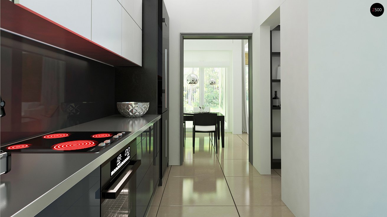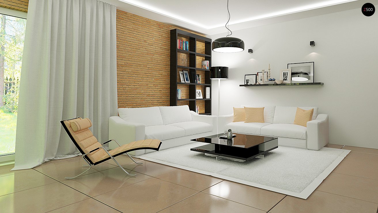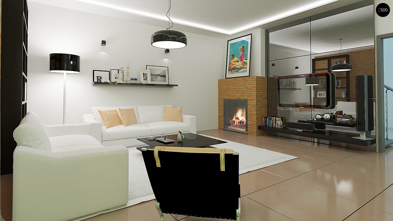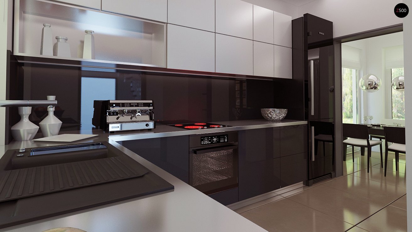 - Дневная зона дома представлена просторной кухней, презентабельной столовой с выходом на террасу крыто типа и уютной гостиной с камином в углу.