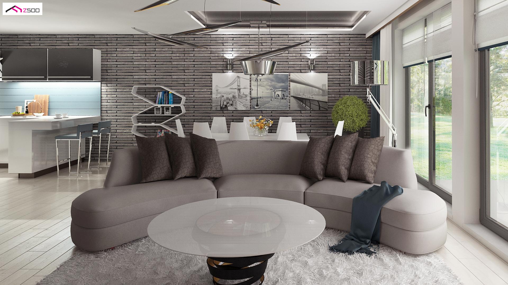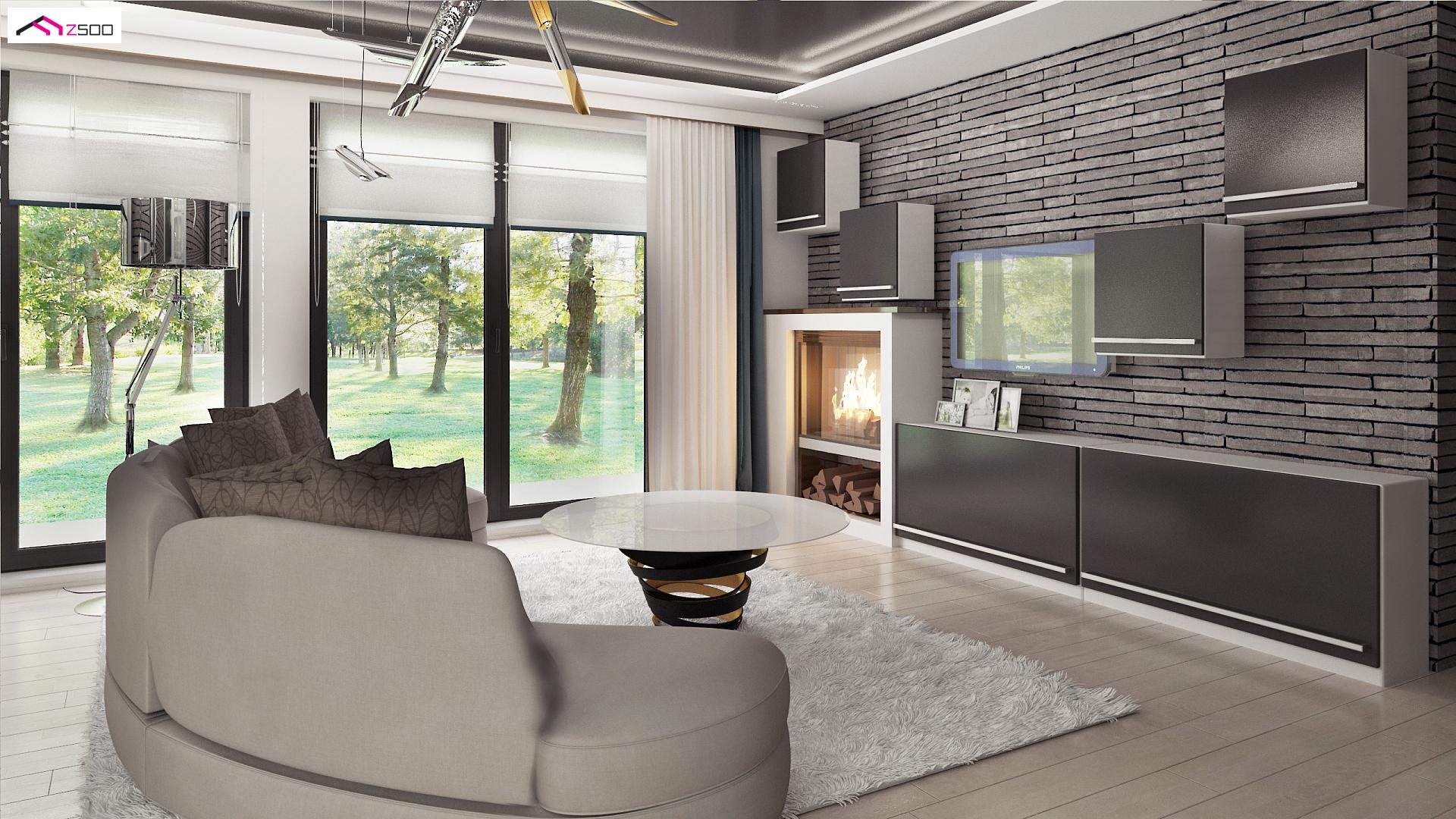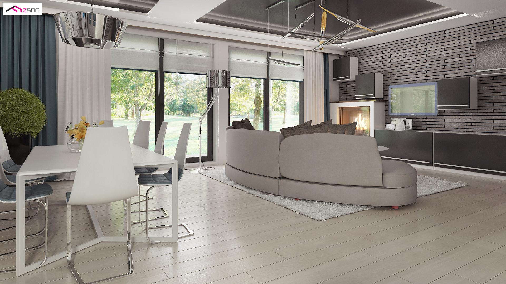 - Дневная зона светла, комфортна и просторна. Теплом и уютом данная зона наполняется за счет камина, спроектированного в углу.