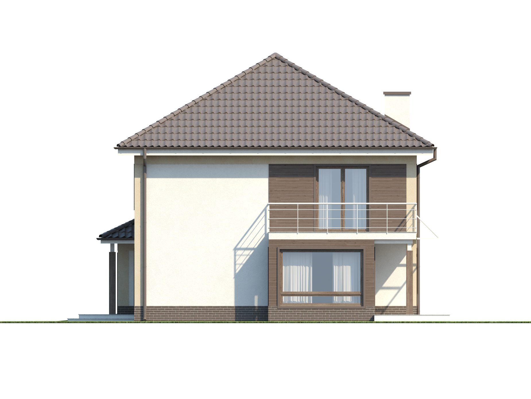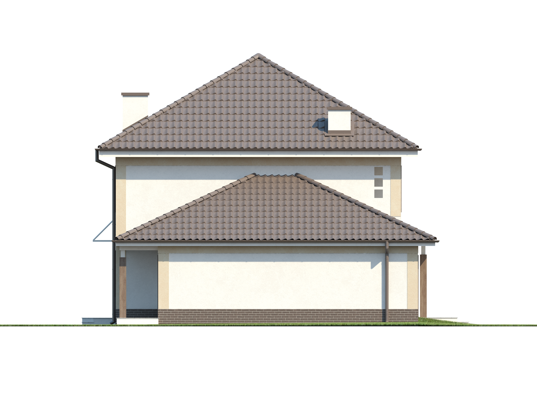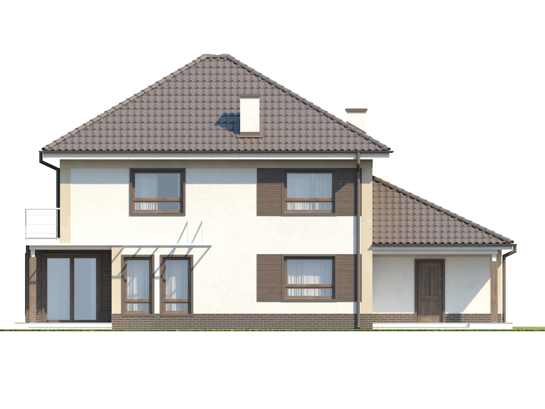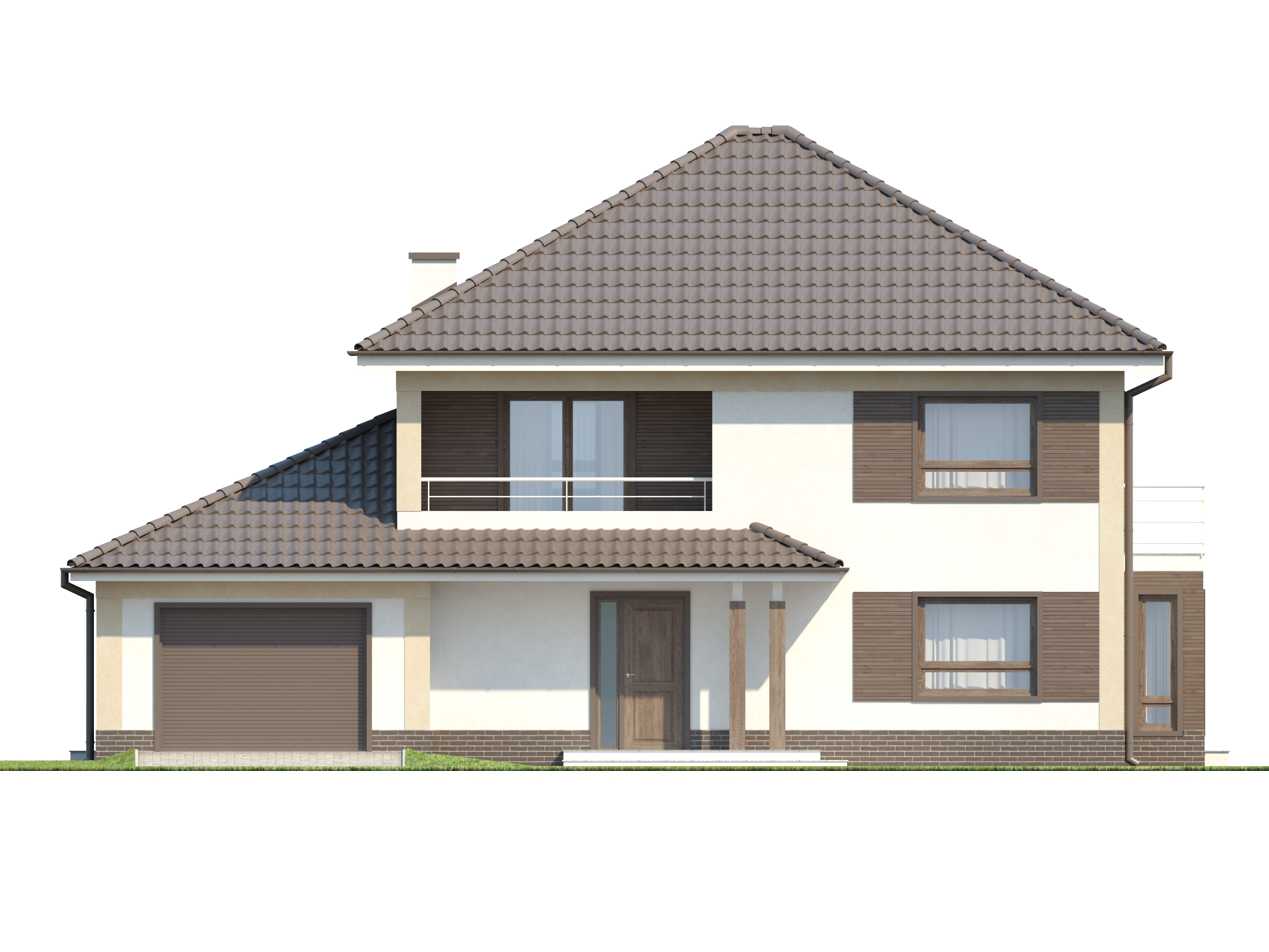 Проэкты двухэтажных домов можно найти на любой вкус и кошелек. Для тех, кто привык к комфорту, будет интересен домZx12, выполненный в лучших традициях архитектуры и имеющий собственный гараж. Входную группу обрамляют колонны, а окна имеют нетривиальную форму проемов.