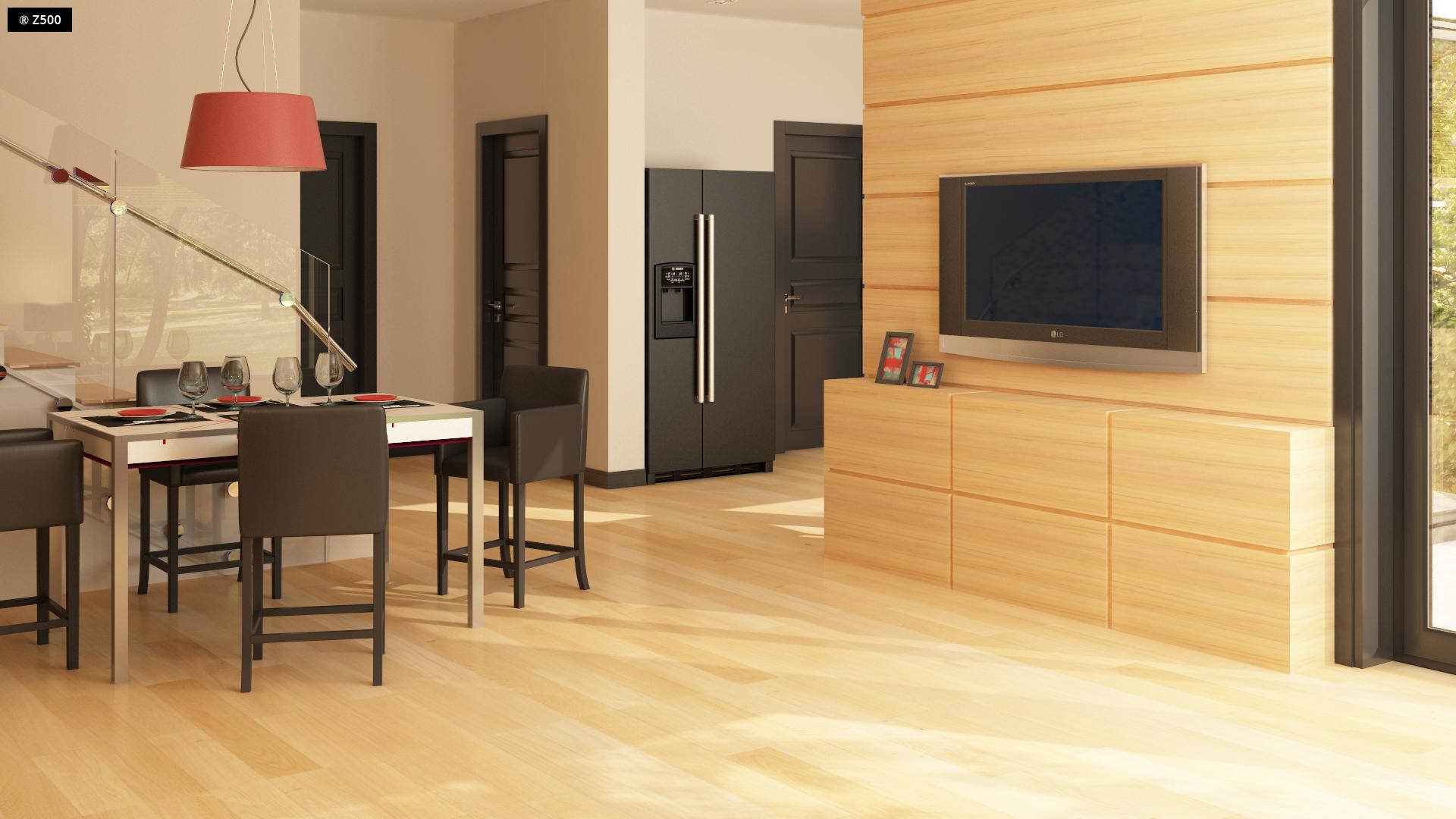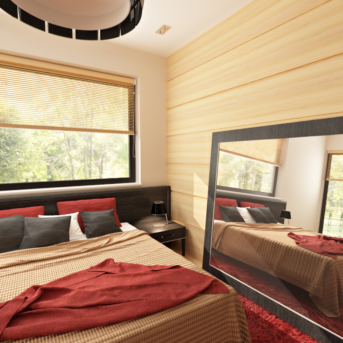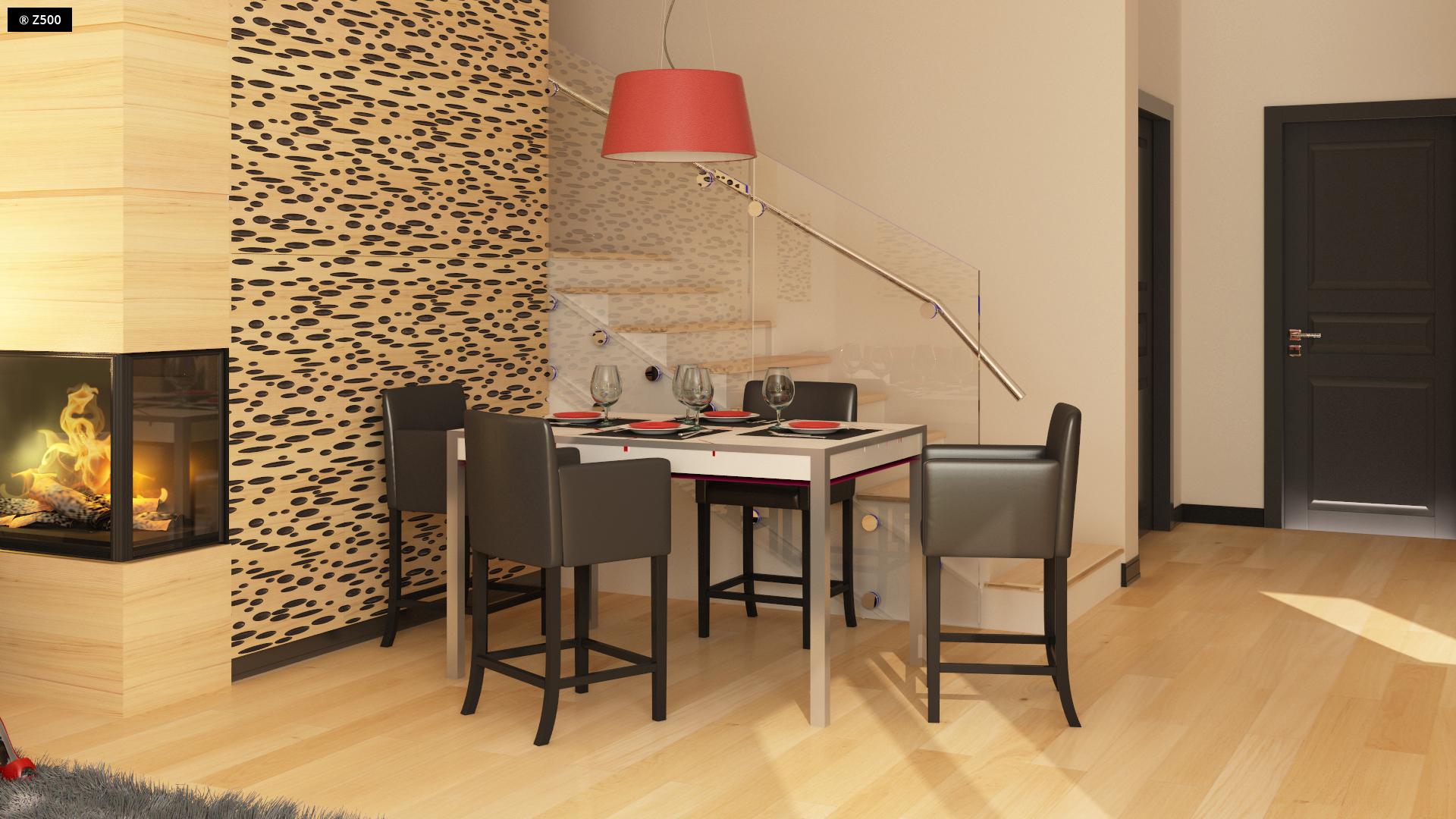 - Расчет каркасного дома был направлен на создание гармоничной планировки. Сложная форма дневной зоны разделяет её функционально. Первый этаж имеет санузел и свободную комнату.
