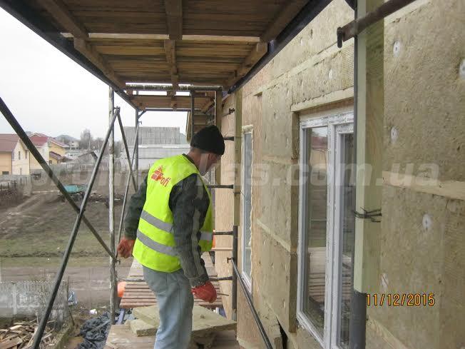 Погода позволяет — продолжаем работать :-) Идет подготовка для фасадных работ на доме для двух семей. Готовы опорные прогоны к которым будут крепиться фермы навеса дома. Крепим утеплитель на фасады. Следующий этап — монтаж аквапанелей.