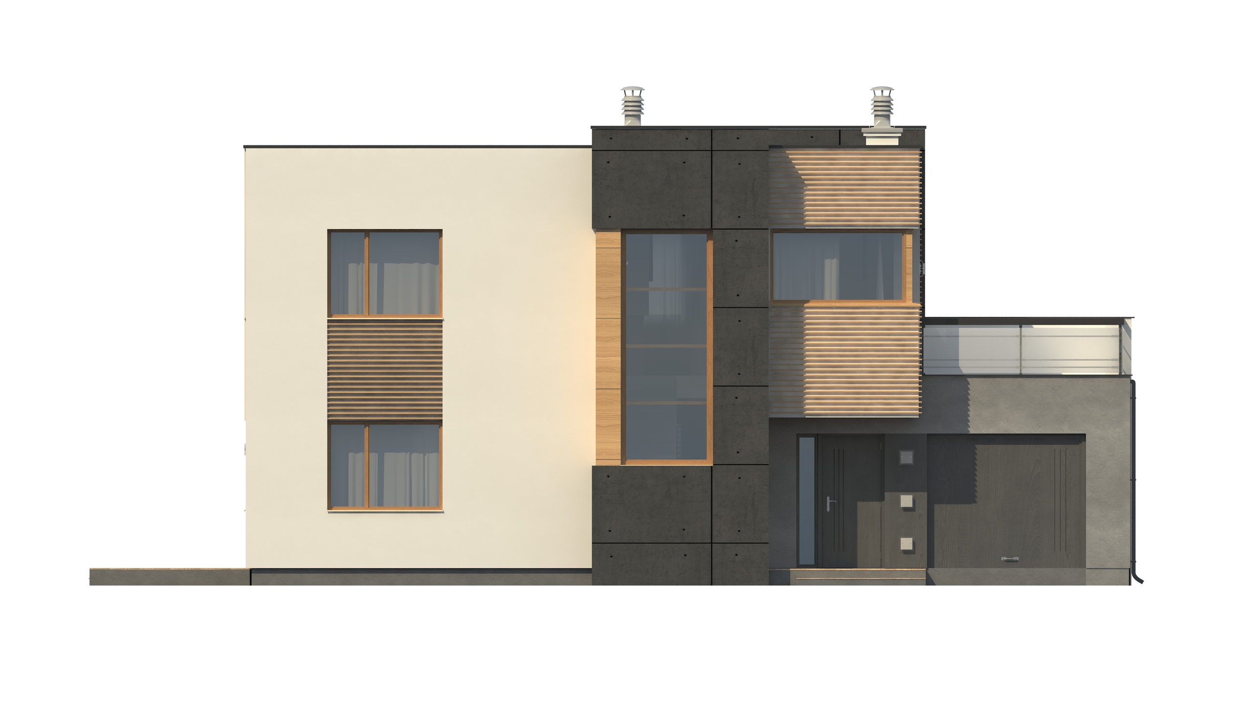 Каркасні будинки, робота над проектами яких ведеться в частині створення комфортного планування, представлені двоповерховим будинком Zx59 з чудовою терасою і гаражем. Його дизайн у стилі модерн, який диктує помітне оформлення фасадів, виділяється і заскленим еркером, в якому спроєктовані сходи.