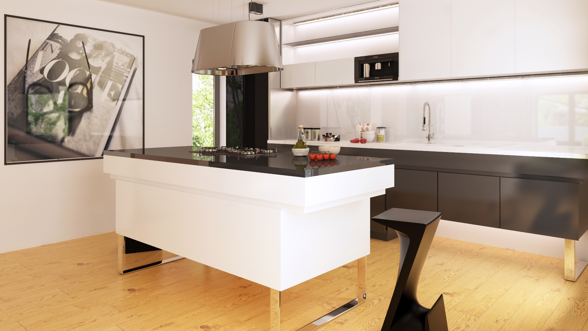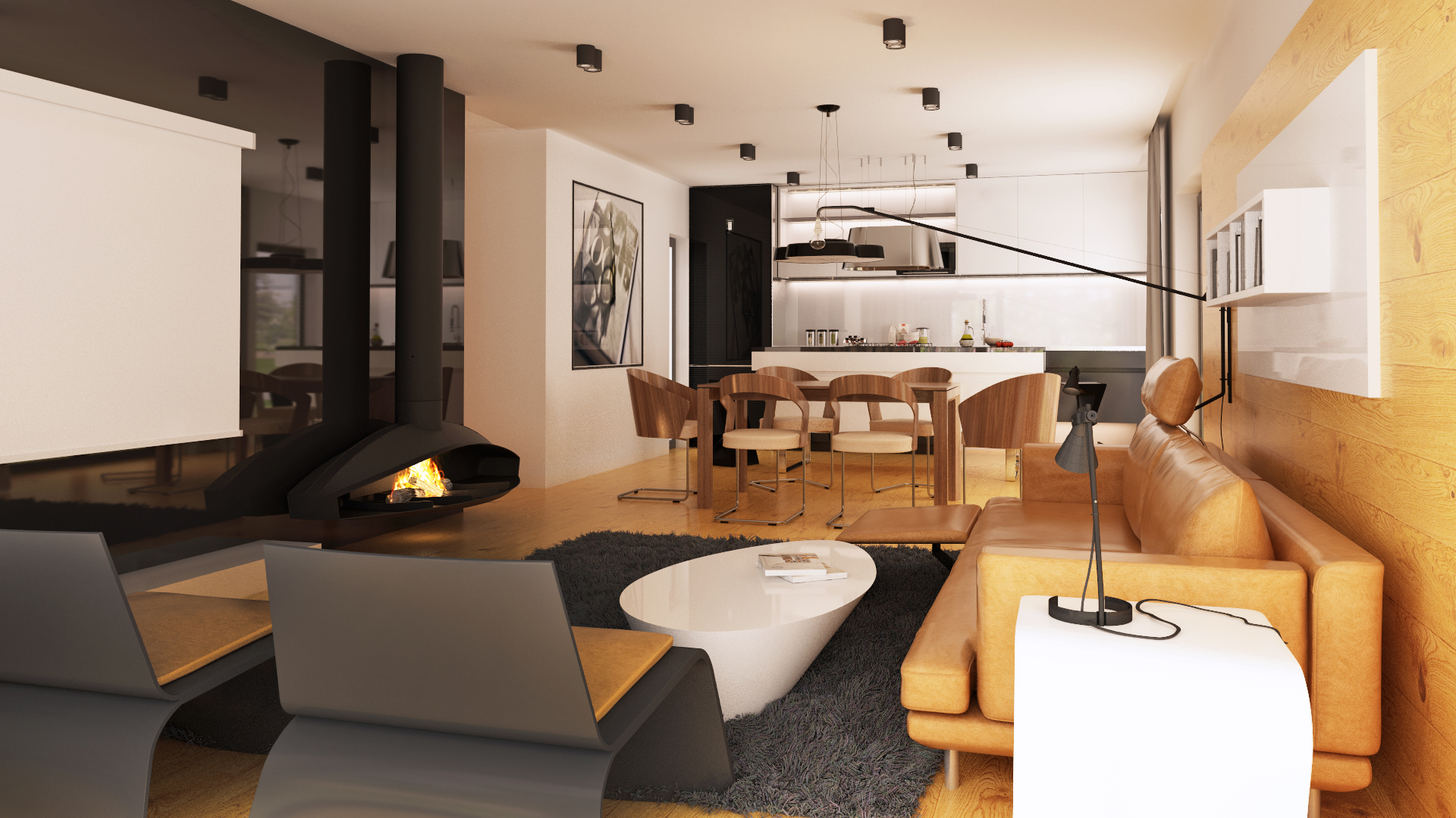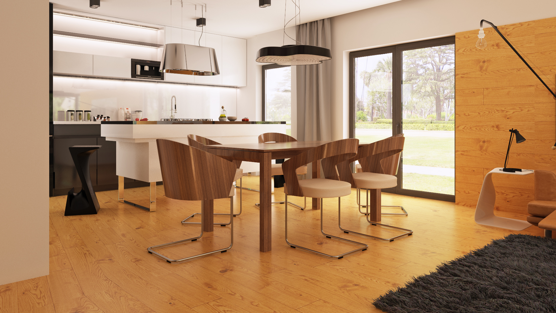 - Ліва частина будинку – це простора денна зона з відкритою кухнею, вітальнею й обідньою зоною, яка вміщує великий обідній стіл.