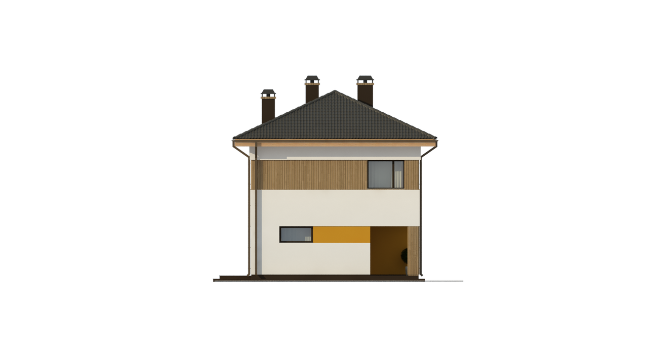 - Відмінною рисою даного проекту є яскравий, незвичайний дизайн екстер'єру, в якому вдало поєднуються елементи обшивки з натурального дерева, жовта і біла штукатурка. Такий зовнішній вигляд робить каркасний будинок Zz3 привабливим і оригінальним;