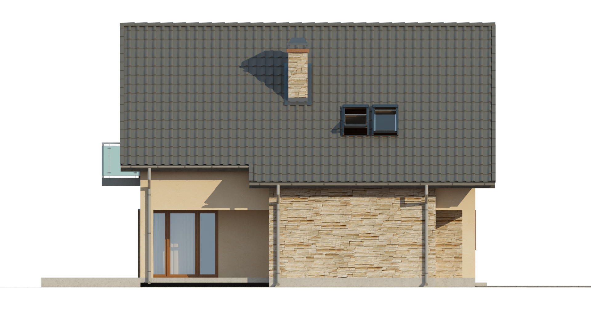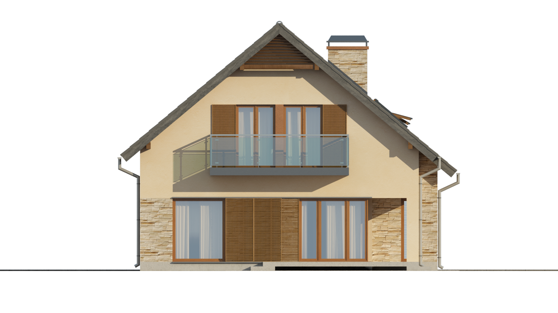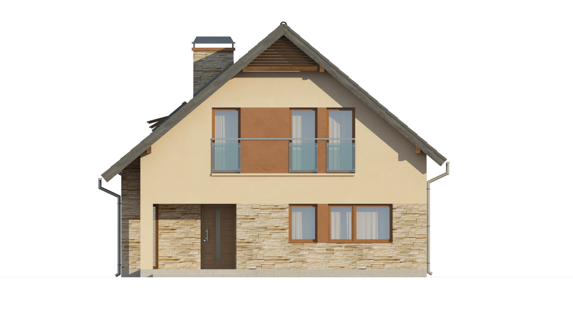 Будівництво каркасних будинків в Україні за проектом Z134 і за її межами приверне увагу до котеджу завдяки аркадам, що прикрашають терасу і вхідну групу, а також суворій елегантності зовнішньої обробки із фасадного каменю та штукатурки.