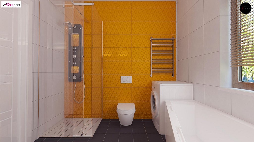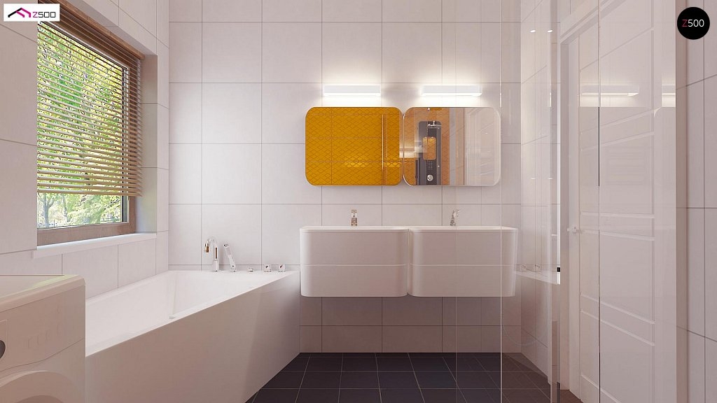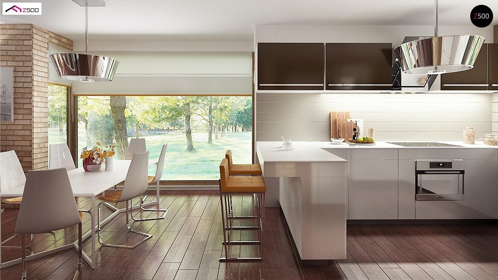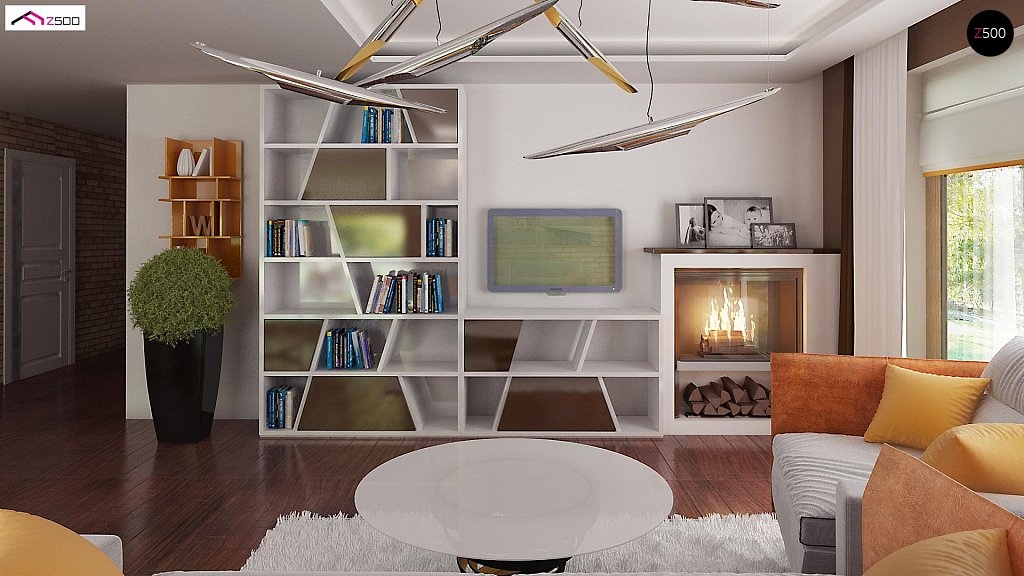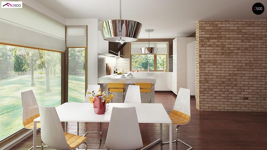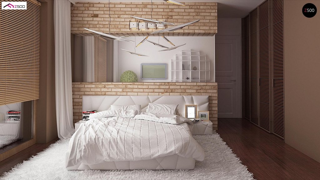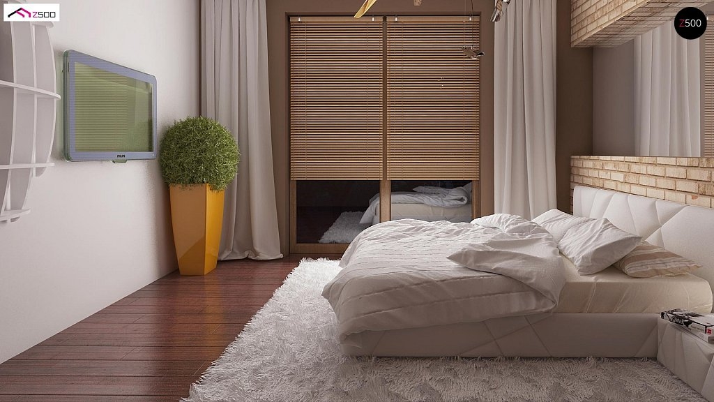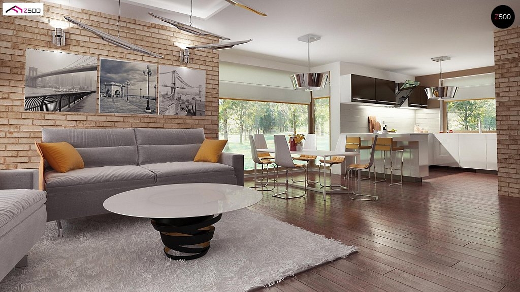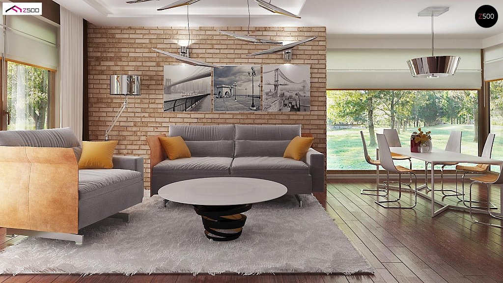 Проєкт Z205 виконаний у вигляді практичного будинку в один поверх, що має чотири спальні та гараж. Покрівля, що має чотири скати, красиві фасади одноповерхових будинків за проєктом Z205, які запроєктовані із застосуванням теплих відтінків цегли, дарують котеджу затишний, сімейний характер.