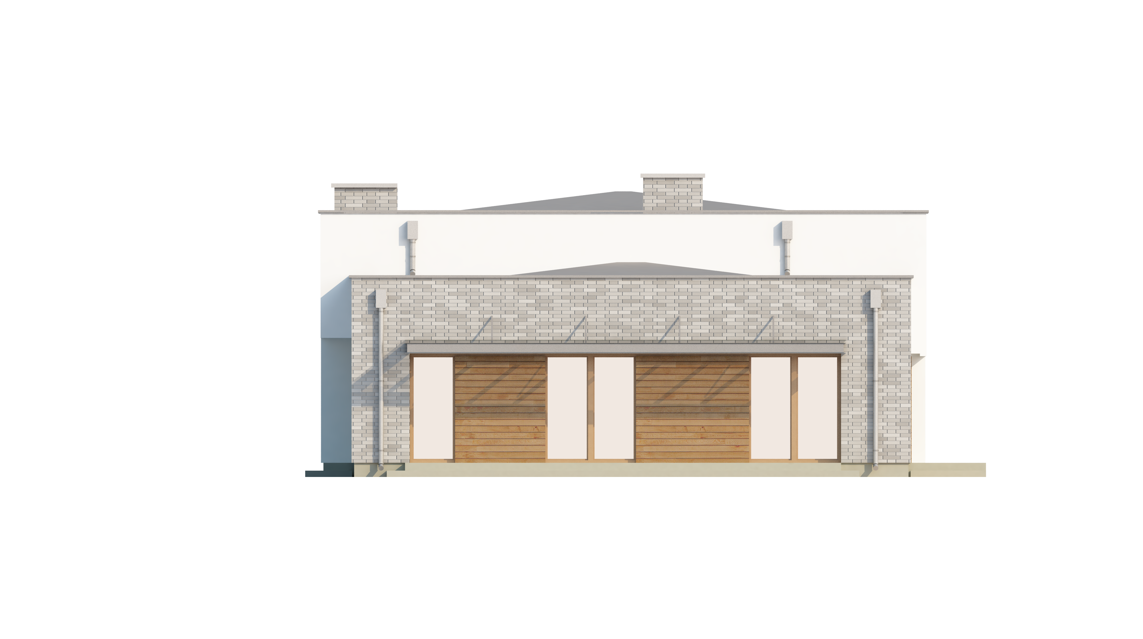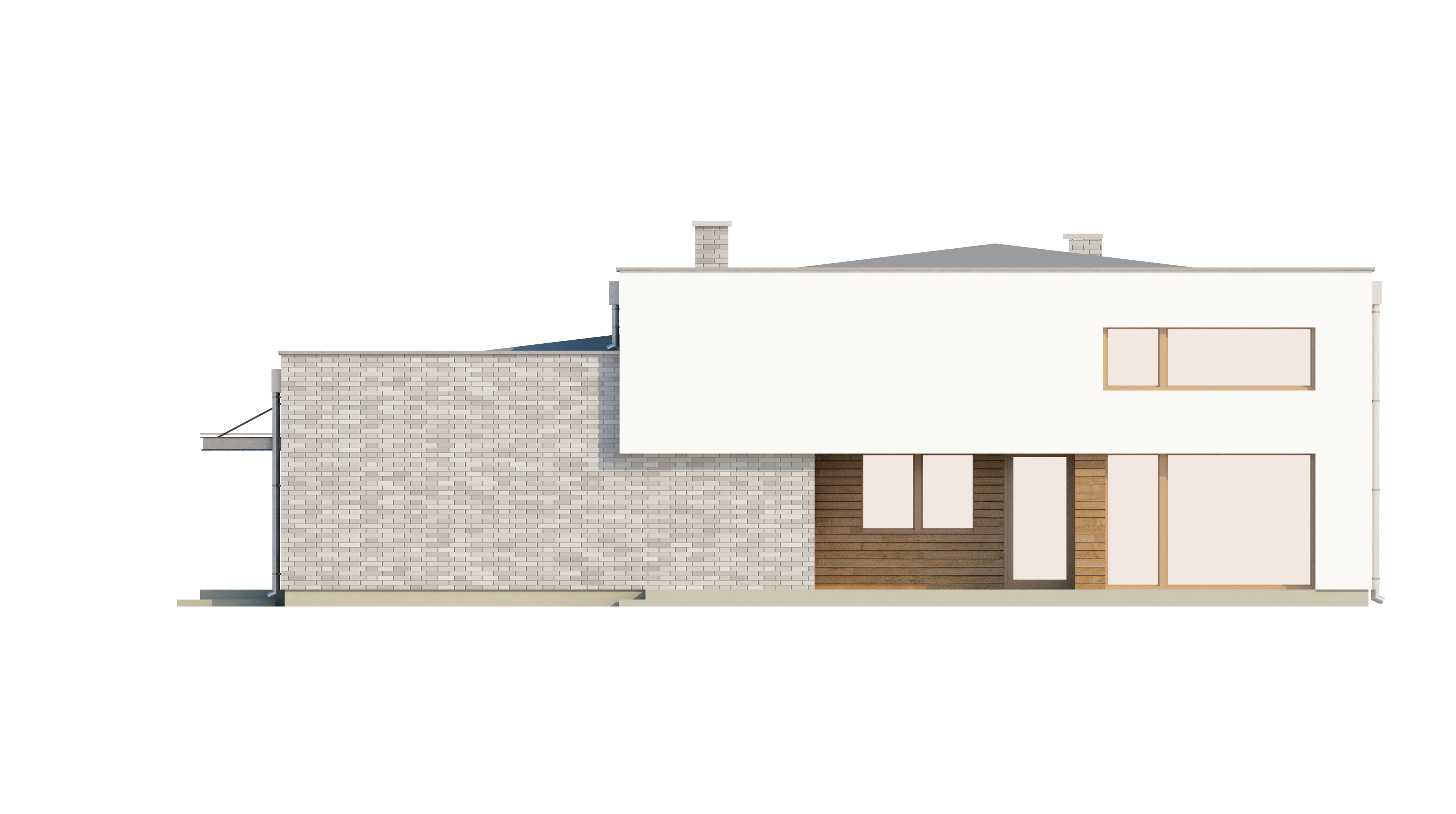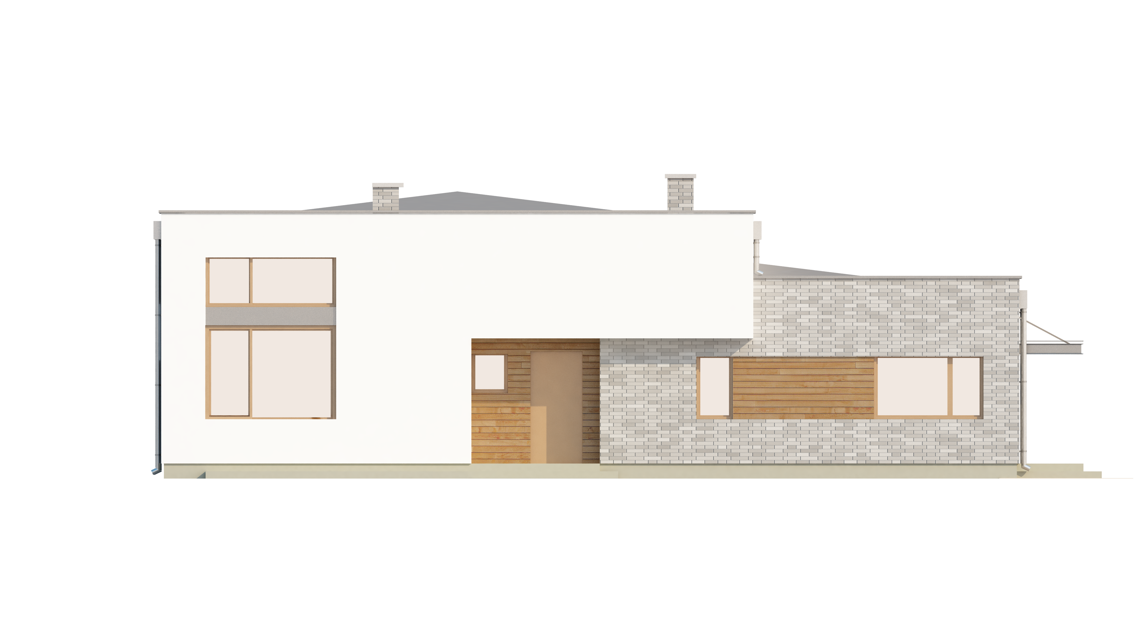 Сучасний і практичний проєкт Zx34 представляє одноповерхові будинки з плоским дахом у нашому каталозі. Контрастна обробка будинку у вигляді молочного кольору штукатурки і сірого каменю, врівноважується дерев'яними вставками.