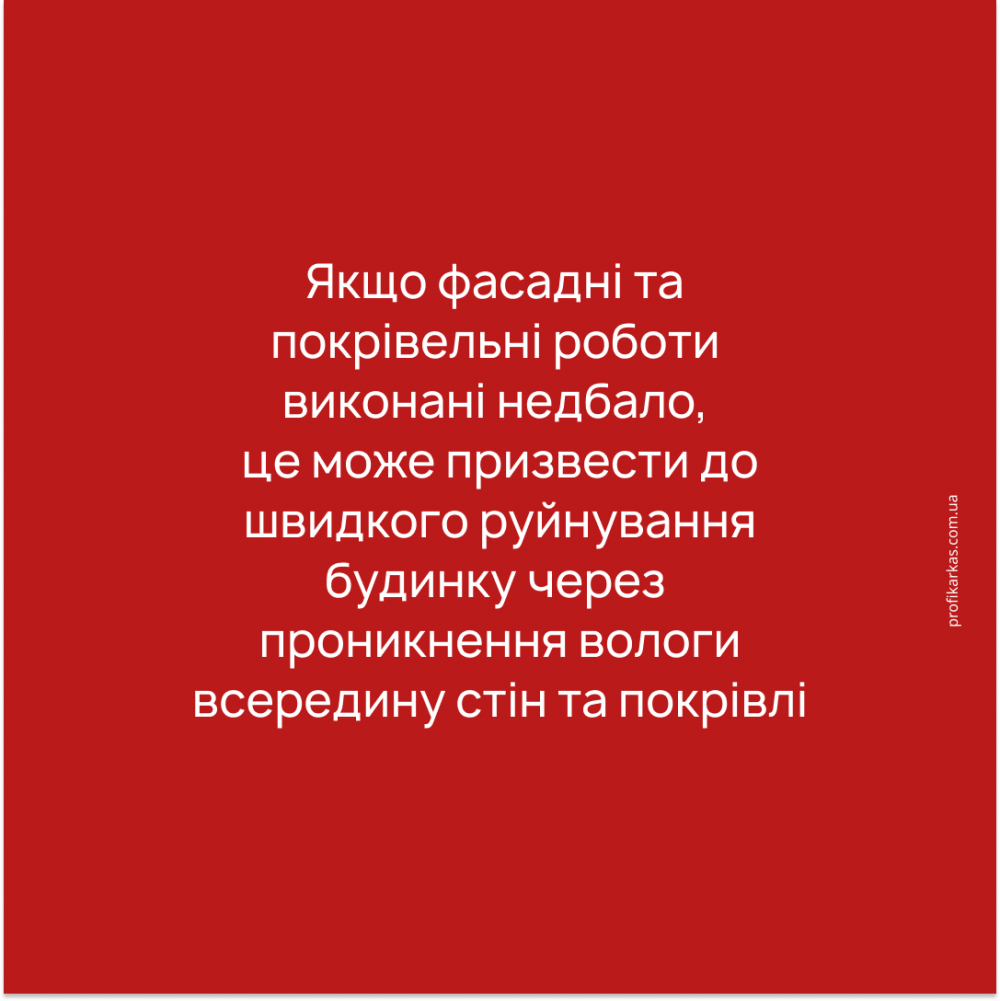 Якщо фасадні та покрівельні роботи виконані недбало, це може призвести до швидкого руйнування будинку через проникнення вологи всередину стін та покрівлі. Тому ми пильно стежимо за якістю робіт, щоб забезпечити максимальний захист вашого будинку від вологи.