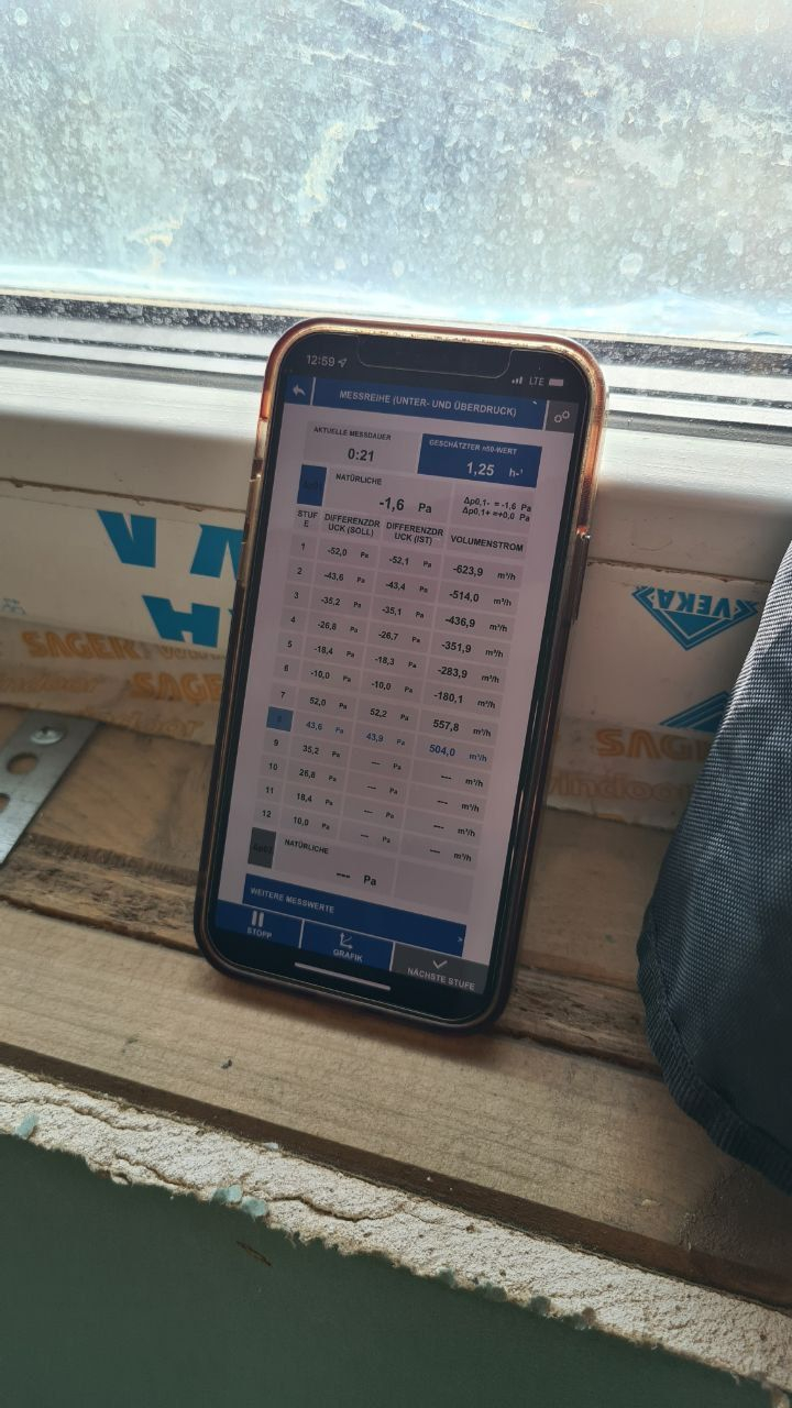 На фото внизу результат Blower door test з будинку, побудованого Профікаркас в Німеччині цього року. Показник становить 1,25, що вказує на хорошу герметичність та якість виконання нашої роботи.