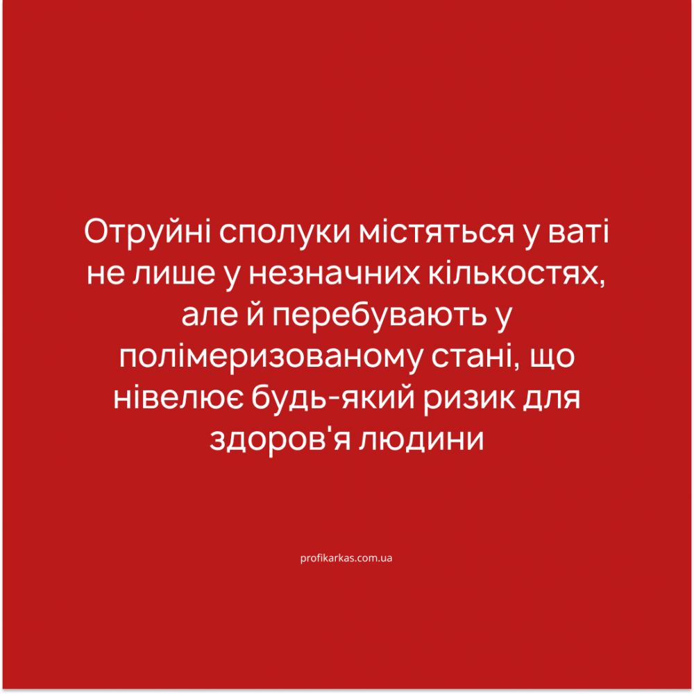Важливо зазначити, що отруйні сполуки не лише містяться у ваті у незначних кількостях, але й перебувають у полімеризованому стані, що нівелює будь-який ризик для здоров'я людини. Таким чином, небезпека від цих речовин є мінімальною.