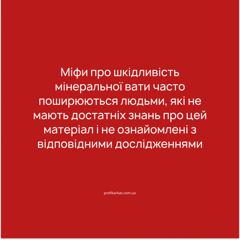 Те, що мінеральна вата є безпечним будівельним матеріалом, підтверджено і Всесвітньою організацією охорони здоров'я (ВООЗ) і результатами досліджень, які проводяться з 1945 року. До того ж, мінеральна вата використовується широко на заході, де велика увага приділяється безпеці і якості будівельних матеріалів. Важливо зазначити, що міфи про шкідливість мінеральної вати часто поширюються людьми, які не мають достатніх знань про цей матеріал і не ознайомлені з відповідними дослідженнями.