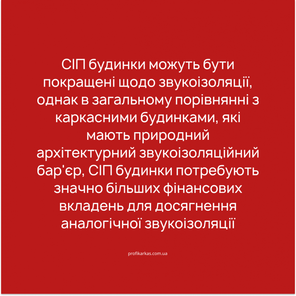 Узагалі, пінополістирол дуже неефективний у ролі звукоізоляційного матеріалу порівняно з іншими більш щільними та звукоізоляційними матеріалами. Звісно, СІП будинки також можуть бути покращені щодо звукоізоляції, використовуючи спеціальні звукоізоляційні матеріали, подвійні стіни або інші технічні рішення. Однак в загальному порівнянні з каркасними будинками, які мають природний архітектурний звукоізоляційний бар'єр, СІП будинки потребують значно більших фінансових вкладень для досягнення аналогічної звукоізоляції.
