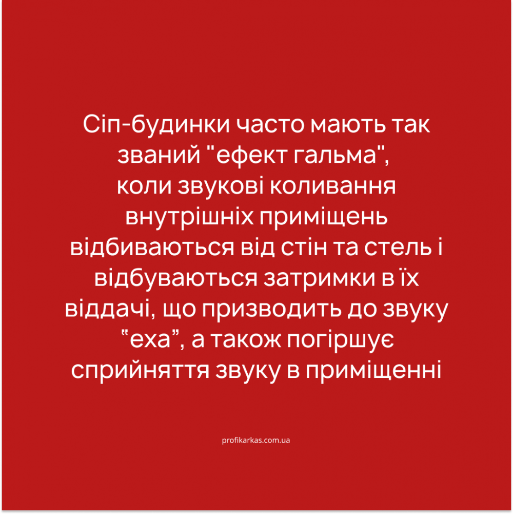 Ефект "гальма". Сіп-будинки часто мають так званий "ефект гальма", коли звукові коливання внутрішніх приміщень відбиваються від стін та стель і відбуваються затримки в їх віддачі. Це призводить до звуку “еха”, а також погіршує сприйняття звуку в приміщенні. |