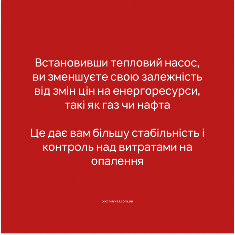 Встановивши тепловий насос, ви зменшуєте свою залежність від змін цін на енергоресурси, такі як газ чи нафта. Це дає вам більшу стабільність і контроль над витратами на опалення.