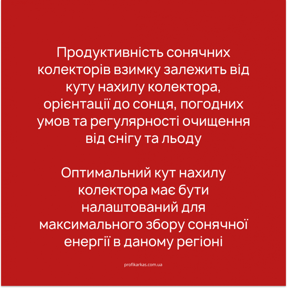 Продуктивність сонячних колекторів взимку залежить від куту нахилу колектора, орієнтації до сонця, погодних умов та регулярності очищення від снігу та льоду. Оптимальний кут нахилу колектора має бути налаштований для максимального збору сонячної енергії в даному регіоні. Більшість систем сонячного опалення мають можливість захисту від морозів, який дозволяє використовувати їх при низьких температурах. Це включає у себе систему антифризу або теплообмінник для запобігання замерзанню теплоносія в колекторі.