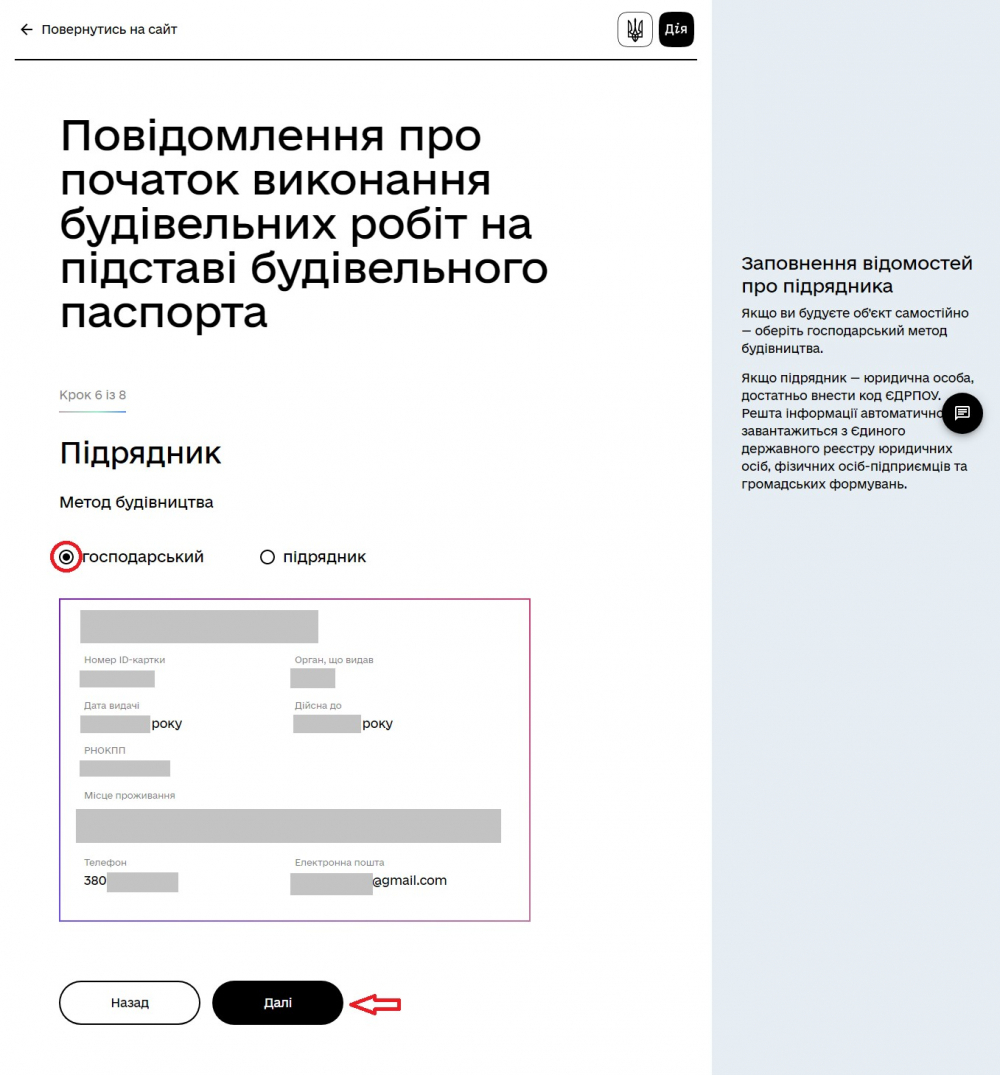 З «господарським» методом все ясно – у разі вибору цього варіанта будівельником призначається забудовник, тобто ви. Якщо натиснути «підрядник», необхідно внести ЄДРПОУ юридичні особи компанії/бригади або паспортні дані індивідуального підрядника.