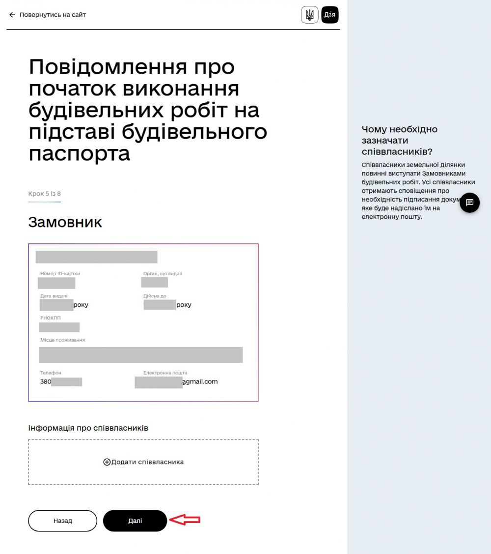 Цей крок нам також варто пояснити детальніше. Тут нас запитують про проектувальника і в нас ще є два варіанти: заповнити дані про нього або натиснути «ні» і це буде фінальним кроком.