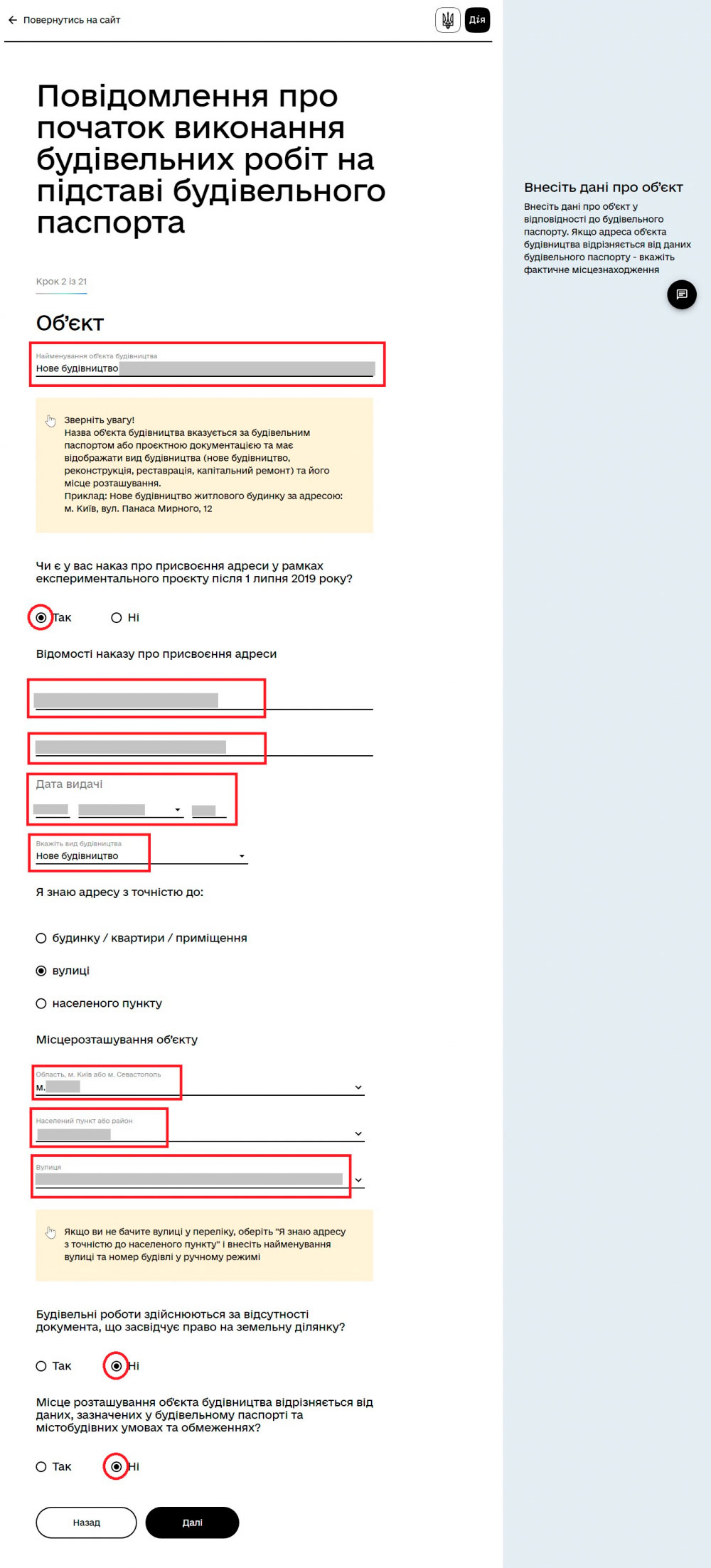 Наступним кроком вносимо інформацію про майбутній об'єкт забудови: вид будівництва (нове будівництво, реконструкція тощо) та фактичне розташування. Якщо паспорт було оформлено після 1 червня 2019 року, об'єкту забудови було присвоєно адресу уповноваженим органом.