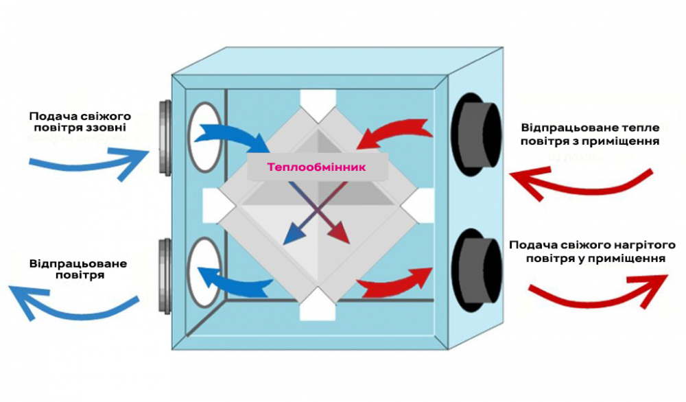 Головна перевага такої системи – значне зниження тепловтрат через вентиляцію при постійному насиченні приміщень свіжим повітрям. Далі детально зупинимось на кожній з переваг: