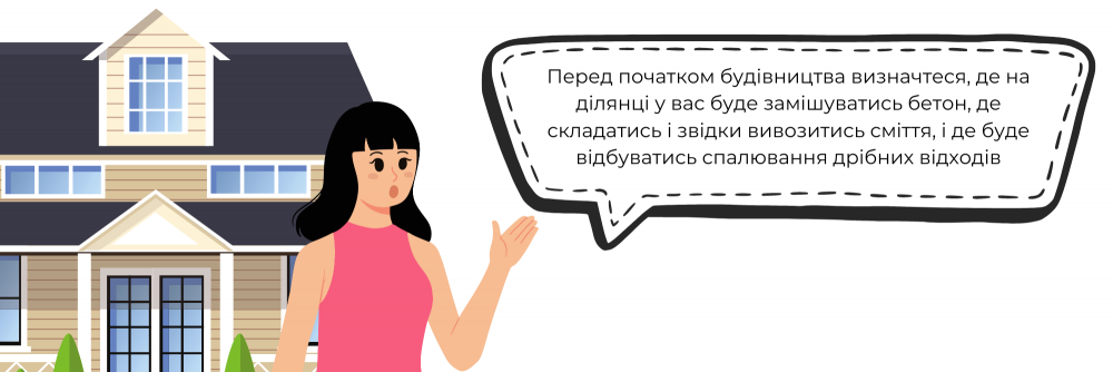 - Перед початком будівництва визначтеся, де на ділянці у вас буде замішуватись бетон, де складатись і звідки вивозитись сміття, і де буде відбуватись спалювання дрібних відходів. Це дозволить зберегти порядок та захистити землю від продуктів згоряння та бетону.