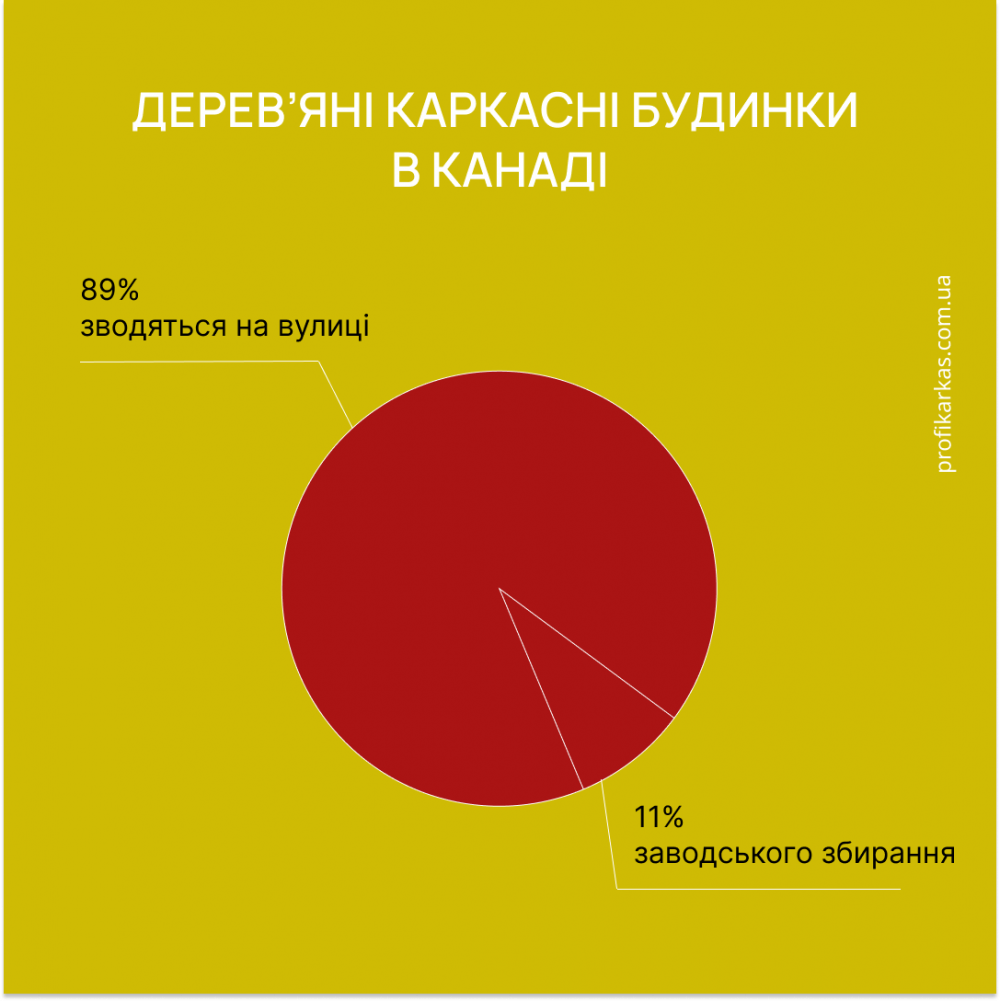 В Канаді 99% каркасних будинків мають в основі дерев’яний каркас (1% — це сталь та інші види каркасного будівництва). З них 89% зводяться “на вулиці”, тобто заводське складання припадає на 11% усіх каркасних будинків. Але 20 років назад цей показник складав лише 3-4%.