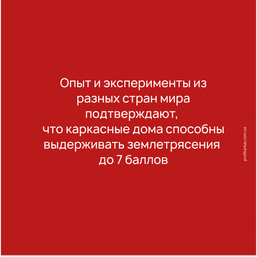 Древесина, которая используется в каркасных домах, имеет высокую упругость и прочность, что позволяет гасить вибрации, возникающие вследствие землетрясения. Кроме того, опыт и эксперименты из разных стран мира подтверждают, что каркасные дома способны выдерживать землетрясения до 7 баллов: