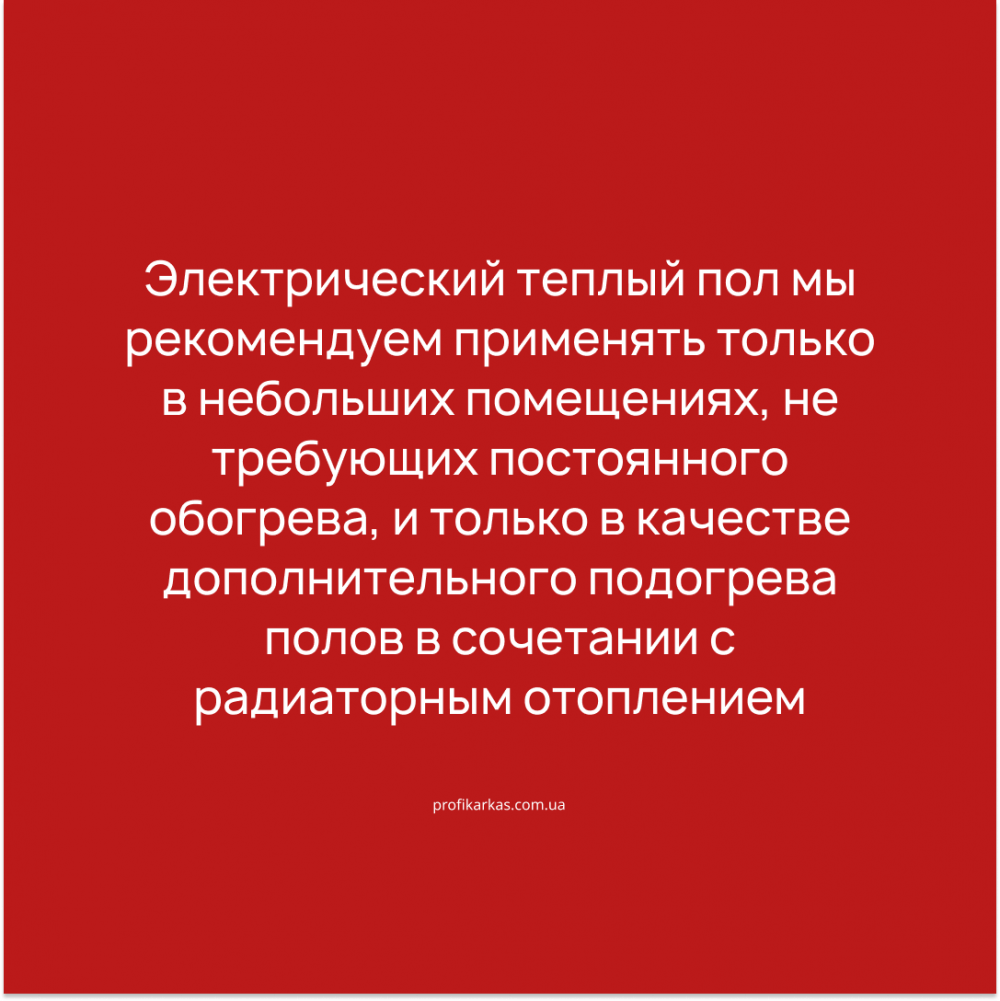 Электрический теплый пол мы рекомендуем применять только в небольших помещениях, в местах, не требующих постоянного обогрева, и только в качестве дополнительного подогрева полов в сочетании с радиаторным отоплением.