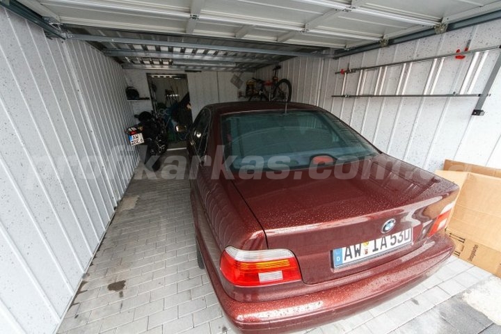 Вот так выглядит гараж. Он стальной, утепленный. Пришлось взять такой, ведь шириной он должен был быть не больше 3,5 м.
