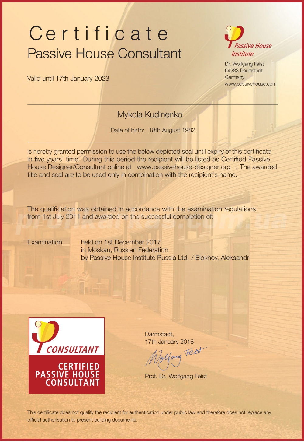 P.S. С 2017 года при строительстве каркасных домов мы используем ключевые принципы пассивного домостроения. В результате такие энергоэффективные дома, даже если и не являются пассивными, значительно теплее классических каркасных домов. Сертификат ниже, выданный на имя директора компании Николая Кудиненко, подтверждает нашу квалификацию :-)