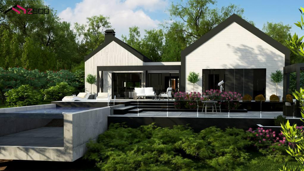 Светлый верх и тёмный низ. Такие решения характерны для современной архитектуры. Основной акцент восприятия направлен на стены, отделка которых должна быть максимально выразительной. Крыша в этом случае не привлекает внимания и просто растворяется в высоте. Дополнительный эффект достигается контрастным выделением окон и дверей.